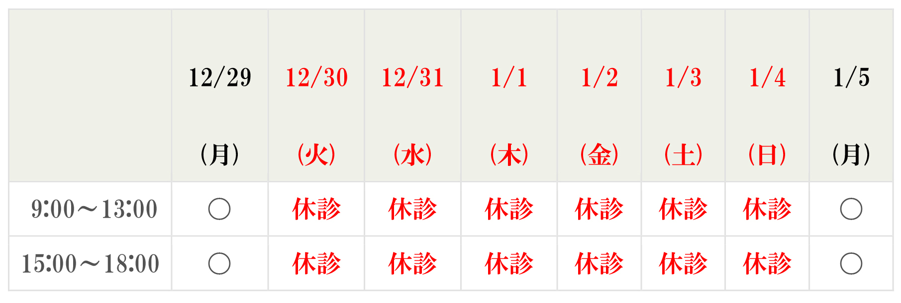 年末・年始休みの診療は以下の通りに行います(〇:通常診察)。